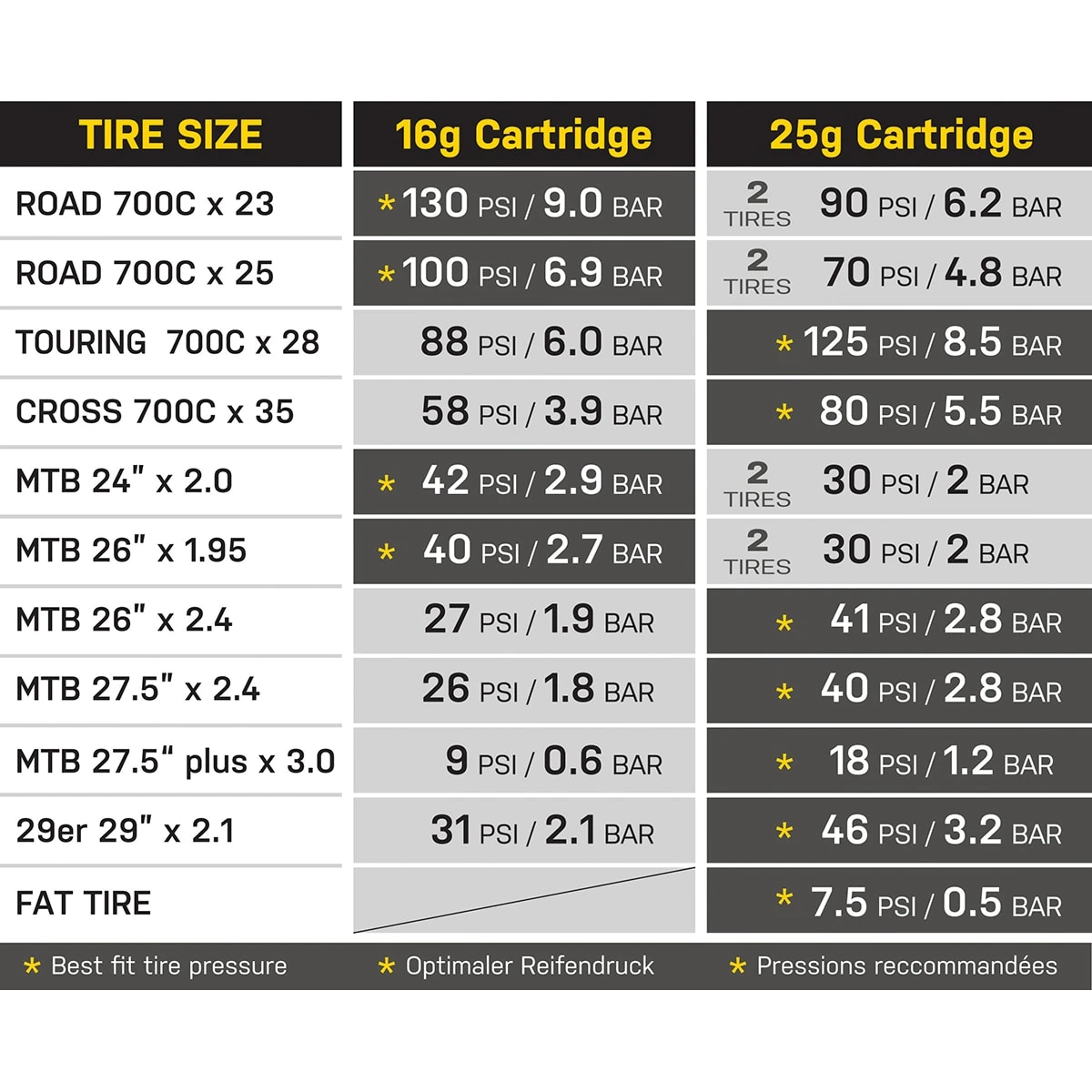 Pressure refuelling for your tyres With Topeak’s CO2 cartridges, tyre inflation becomes so easy: Simply screw the cartridge on a suitable CO2 pump and, within seconds, your tyres are back in shape – ideal for mounting tubeless tyres as well. Topeak’s 16 g CO2 cartridges offer the ideal filling quantity for narrow road tyres or mountain bikes with 26“ wheels. With this generous pack of 5, you will always have a spare cartridge at hand and enough air for your tours.